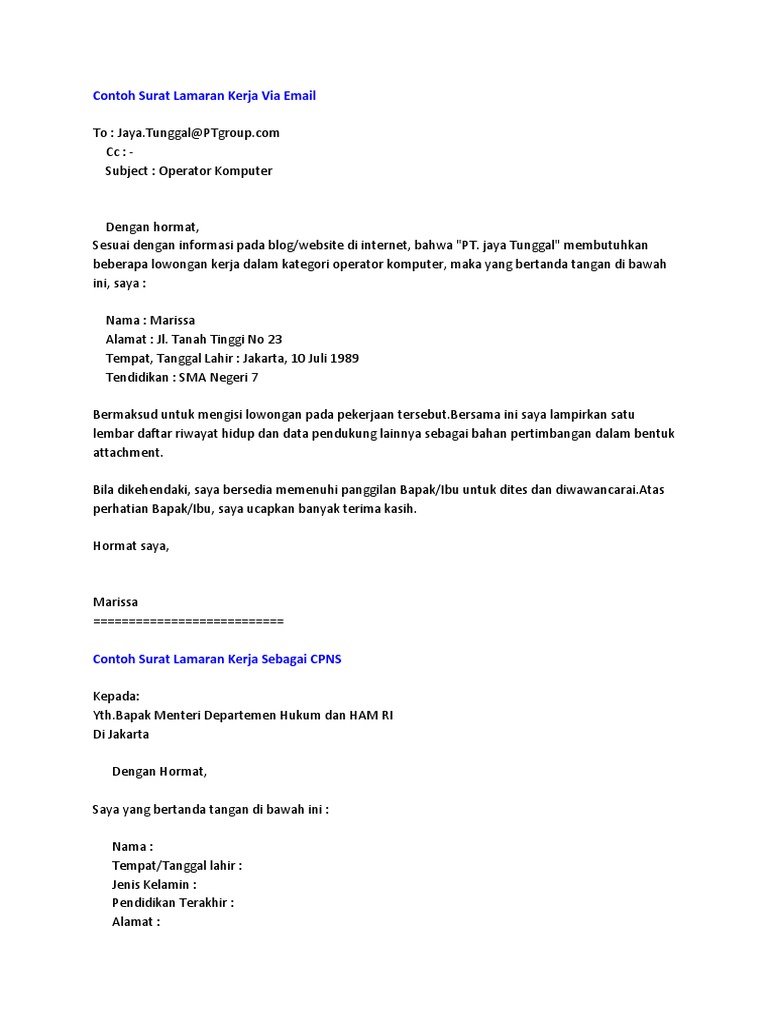 Terkadang ada sebuah lamaran kerja yang tidak perlu kita kirimkan lewat kantor pos melainkan dikirimkan via email. Contoh surat lamaran kerja operator produksi adalah contoh lamaran pekerjaan terbaru yang akan admin bagikan pada kesempatan ini untuk anda yang ingin melamar kerja sebagai operator produksi. Savesave contoh surat lamaran kerja via email.docx for later. Anda sedang membuka postingan contoh surat lamaran kerja via email lengkap yang. Membuat surat lamaran kerja memang terlihat gampang. Hal ini untuk memberikan kesan profesional dan minat kamu yang sungguh. Bagaimana cara mengirim lamaran kerja lewat email? Dengan seiring berjalannya waktu, semua. .via email yang baik dan benar, seiring perkembangan zaman membuat pekerjaan anda lebih muda apa lagi ada contoh surat lamaran kerja via email secara online. Contoh surat lamaran kerja, curiculum vitae / daftar riwayat hidup, lowongan kerja, dll. Dengan surat lamaran kerja ini saya mengajukan permohonan kerja untuk posisi operator produksi. Untuk dapat bekerja di bank, tidak selalu perlu memiliki pelatihan dalam pendidikan perbankan atau sejenisnya. Jika memerlukan contoh surat lamaran kerja dalam bahasa inggris silahkan komentar atau via.