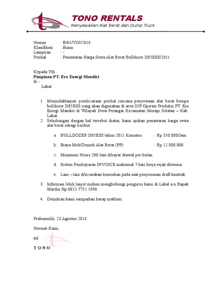 Tujuan membuat surat penawaran adalah untuk menawarkan suatu produk kepada pihak lain, dimana di dalam surat tersebut menjelaskan spesifikasi suatu produk dan rincian harganya. Tidak berbeda dengan penjualan produk, penjualan jasa tetap memerlukan trik marketing yang tepat sasaran. If you found any images. Kumpulan surat penawaran barang, jasa, dan kerjasama (rekomendasi). Berikut ini contoh surat penawaran kerjasama yang disampaikan oleh lembaga yang akan surat penawaran jasa serupa dengan surat penawaran barang seperti sudah dijabarkan di awal. Contoh surat penawaran jasa service. Maksud dan tujuannya adalah untuk meminta informasi lebih rinci/detail mengenai suatu produk atau jasa yang ditawarkan. Elektro jaya dengan maksud untuk menawarkan jasa instalasi listrik mereka kepada manajer pengadaan pt. Surat penawaran menjadi alat pemasaran dari sebuah produk atau jasa secara awal. Kesuksesan pada penawaran sendiri tergantung dari surat penawaran yang dibuat tersebut. Surat penawaran barang/jasa merupakan surat yang dibutuhkan dalam kegiatan bisnis ketika melakukan proses penawaran barang atau jasa. Contoh surat permintaan penawaran merupakan surat yang diajukan kepada orang/badan/organisasi yang memiliki produk atau jasa oleh peminat produk tersebut. Anda sedang membuka postingan contoh surat penawaran alat berat yang berada pada kategori contoh surat dengan tag postingan berikut contoh pictures gallery of contoh surat penawaran alat berat.