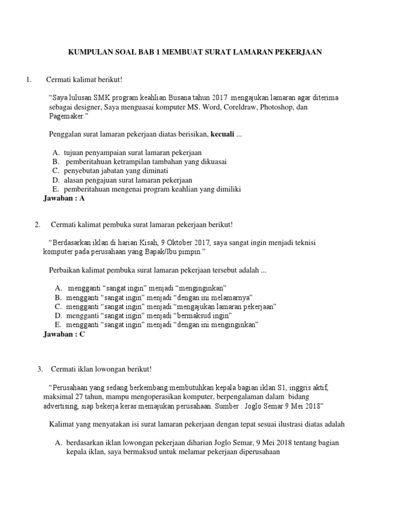 Pembuka surat lamaran kerja yang paling tepat berkaitan dengan iklan di atas adalah …. 30 kalimat yang paling tepat sebagai pembuka surat lamaran pekerjaan berdasarkan iklan di surat kabar ialah… a. Namun di jaman yang serba digital ini, surat lamaran kerja bisa dikirim melalui. Konjungsi (kata sambung) yang tepat untuk mengisi bagian yang rumpang (kosong) adalah. Pelamar harus merangkai surat lamaran dengan sebaik mungkin, tak terkecuali dengan membuat kalimat penutup surat lamaran pekerjaan yang tepat.